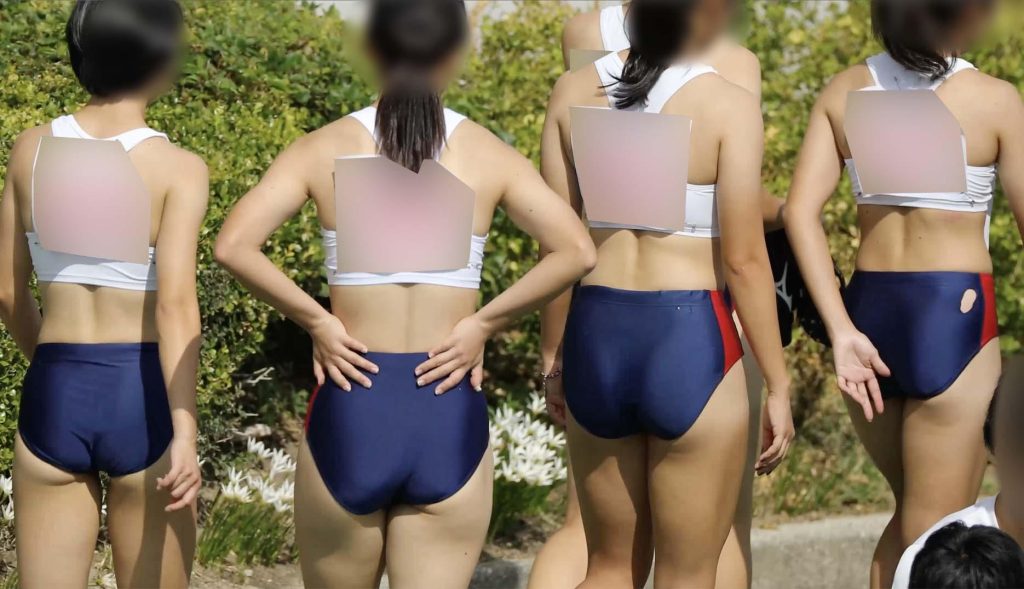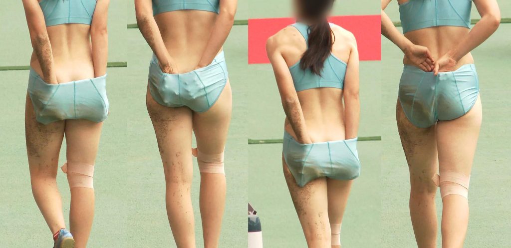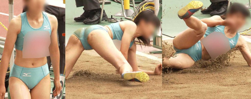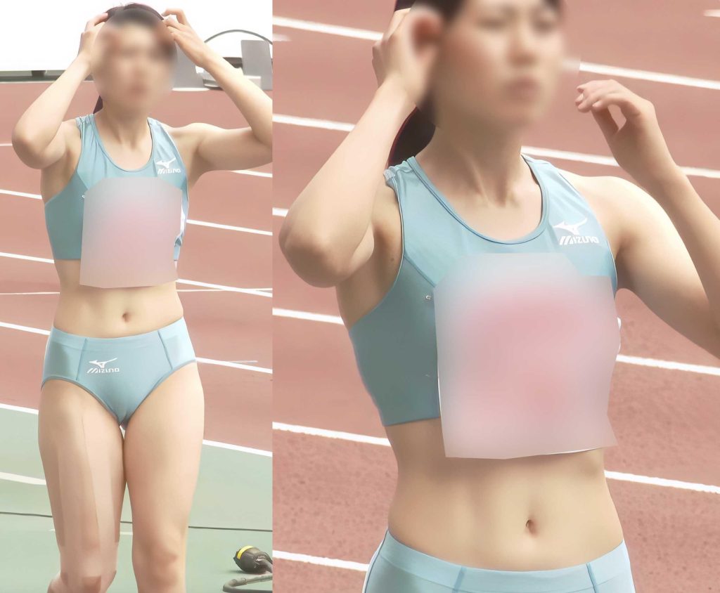 陸上選手の中でもスレンダーな体型ですが、ピッタリとした小さめのブルマを履きこなし前、後両方から大事な部分がはみ出しそうになっている様子にドキドキハラハラさせられてしまいます。