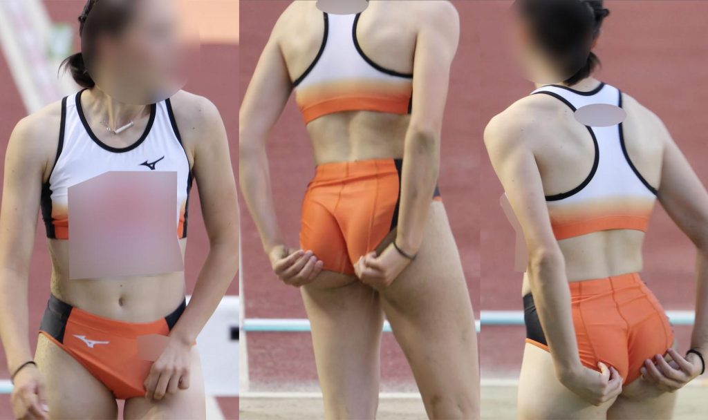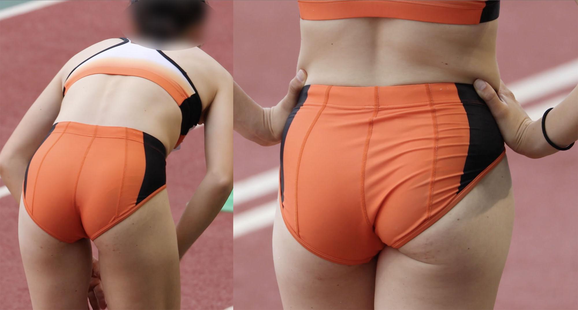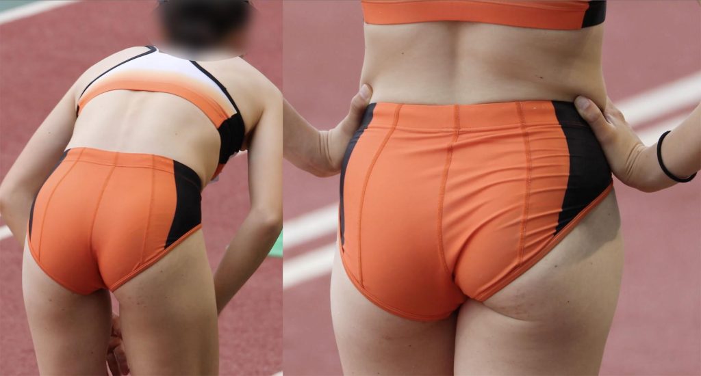動画の最初から7分30秒までは準備運動シーンですが100mといったらクラウチングスタートですよね。こちらが後ろから撮影したのでエロすぎる緑ユニと美尻を突き出してくれてもう観客は虜です。