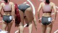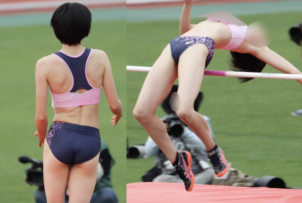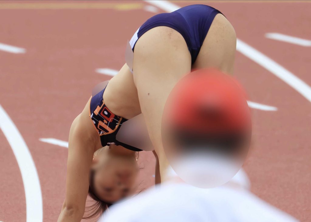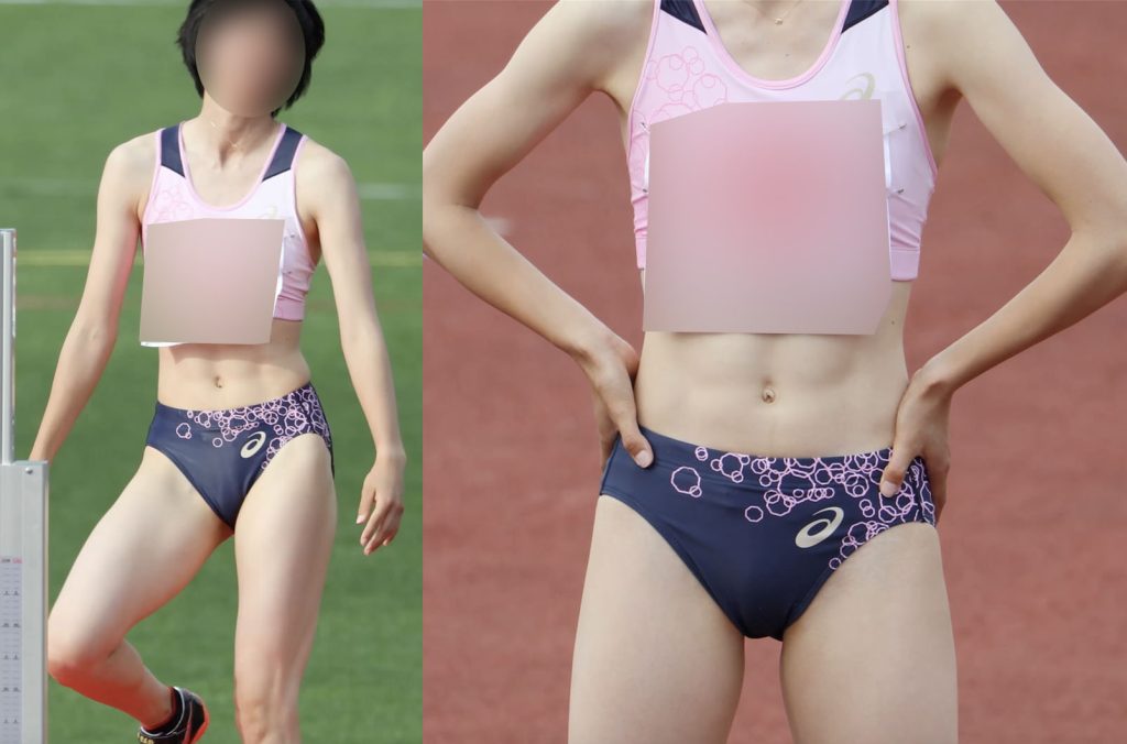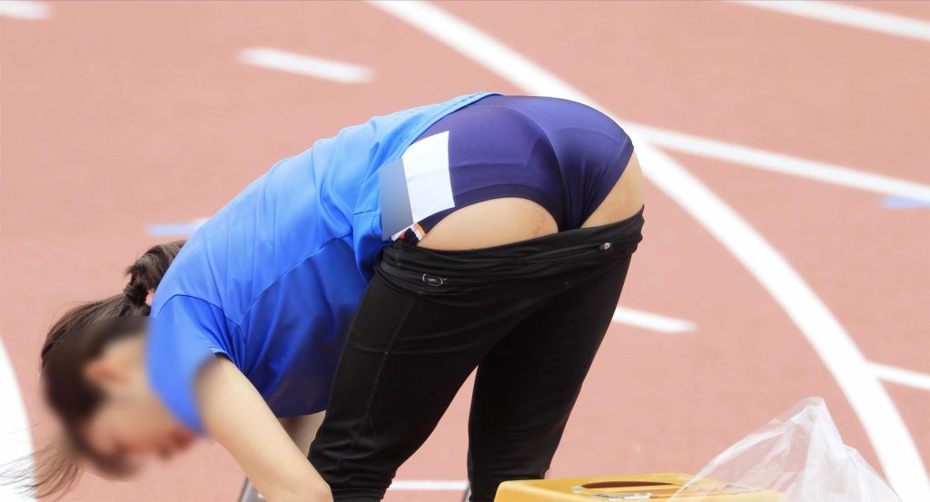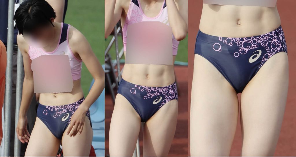 陸上選手の中でもスレンダーな体型ですが、ピッタリとした小さめのブルマを履きこなし前、後両方から大事な部分がはみ出しそうになっている様子にドキドキハラハラさせられてしまいます。